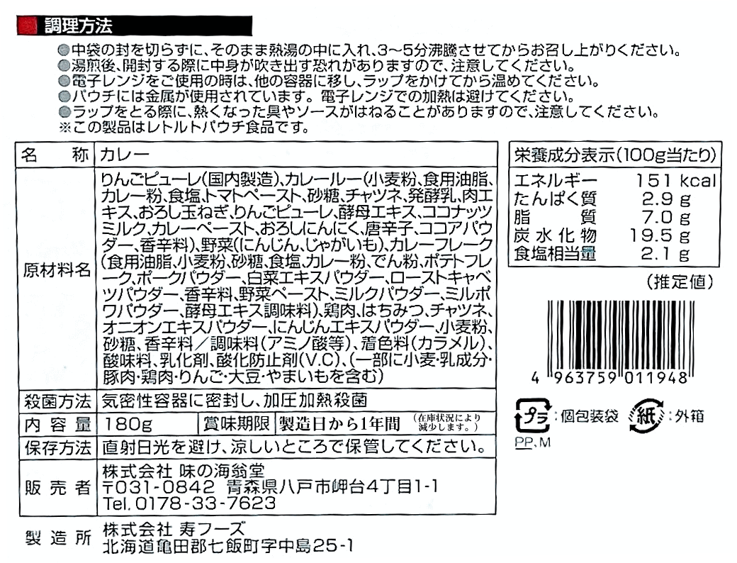 - セールスポイント : 青森地鶏シャモロックと新鮮野菜を厳選したスパイスとともにじっくりと煮込みスパイシーでコクのある贅沢なチキンカレーに仕上げました。