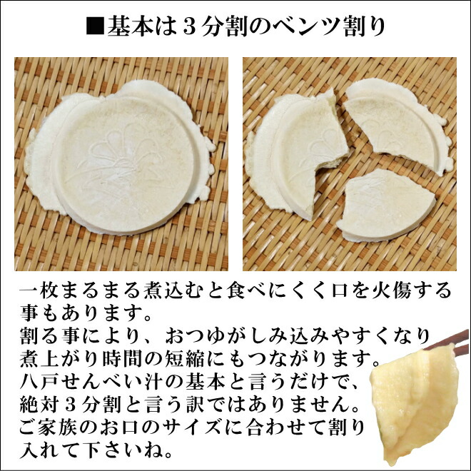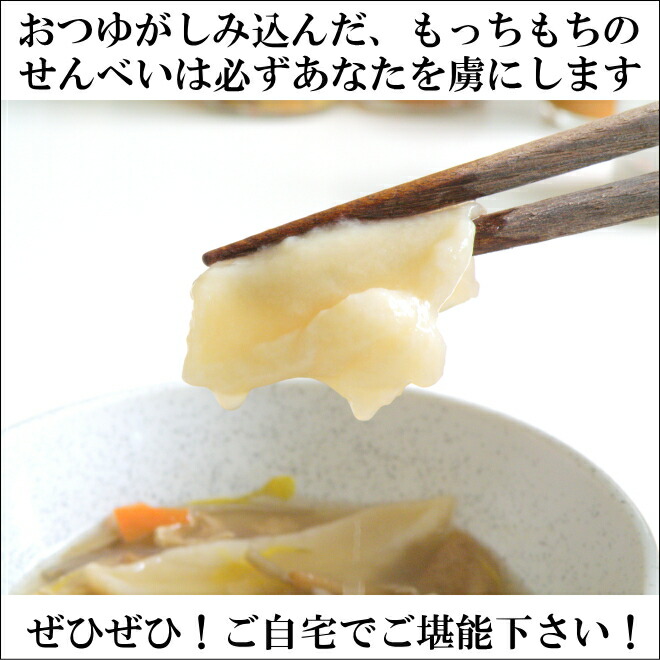 - セールスポイント : 八戸せんべい汁用の煎餅を煮込んでも溶けにくいように厚焼き&固焼きに仕上げました。鍋料理の時に鍋と一緒に割り入れて煮込んでお召し上り下さい。ご自慢の鍋スープがたっぷりしみ込んだ煎餅はモチモチのアルデンテ食感で大変美味しいです。しかも煎餅の食感を長時間お楽しみいただける鍋用のせんべいです。