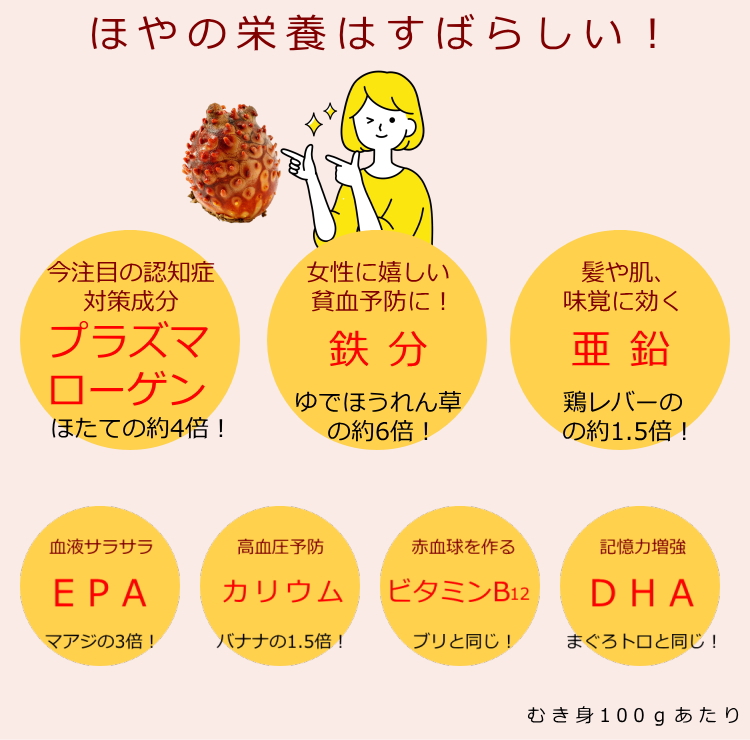 • セールスポイント : 三陸の厳しい海が育んだ磯の香あふれる逸品珍味。保存料、着色料は使用しておりませんので「ほや」本来の旨味を味わえます。「ほや」はその外見から「海のパイナップル」とも呼ばれます。グリコーゲンを豊富に含み、旬を迎える夏場には、その含有量が冬のほやの約8倍にもなり、甘みと旨味が深くなります。