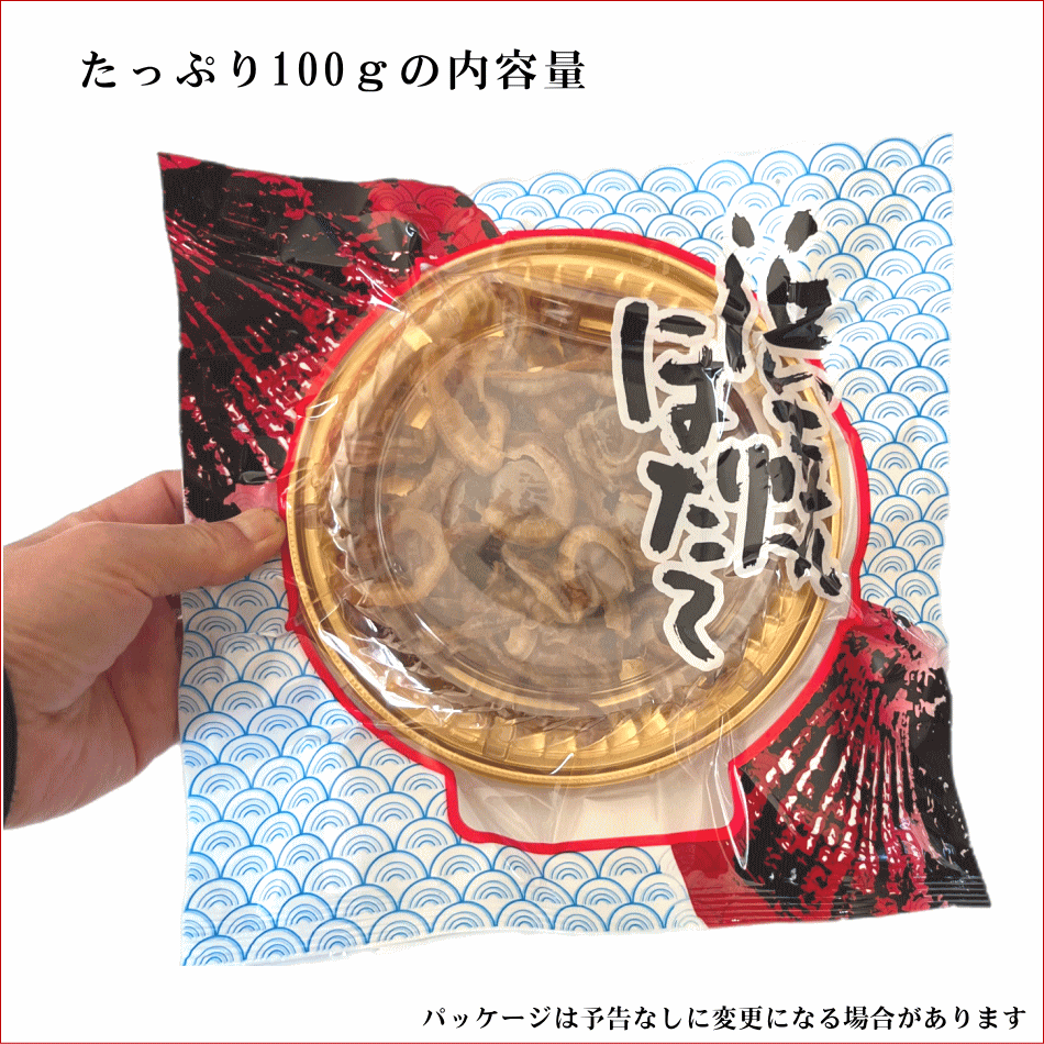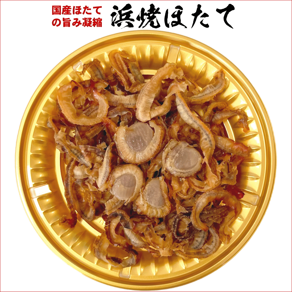 国産の帆立貝ひもと青森県産の貝柱をあまじょっぱい味付けで焼き上げたソフト系駄菓子珍味。