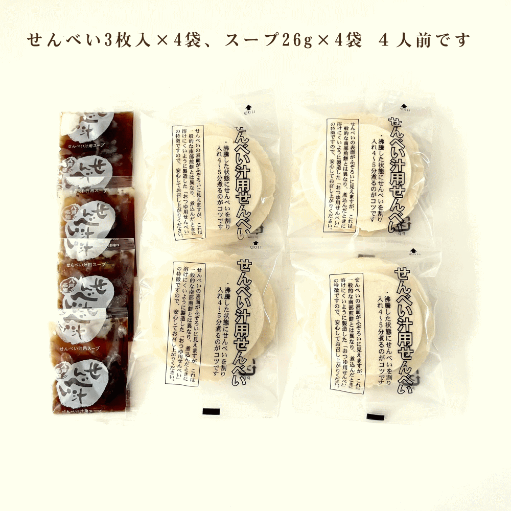 セット内容は、せんべい3枚入✕4袋、スープ26g✕4袋となります。