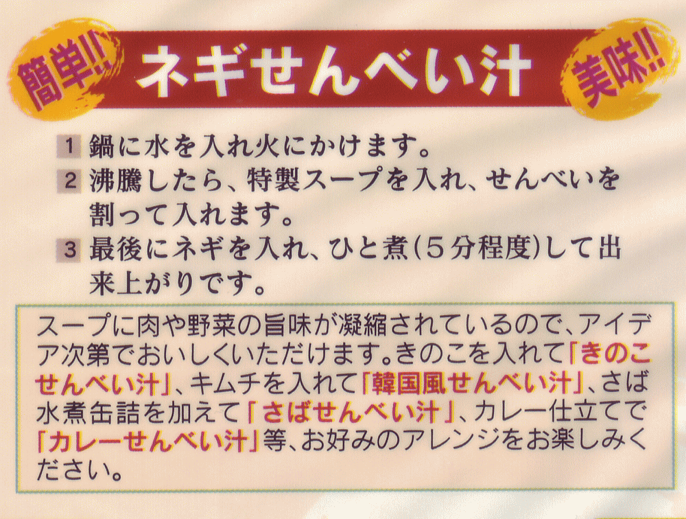 キムチを加えて韓国風キムチせんべい汁、鯖の水煮缶を加えてサバせんべい汁、カレー仕立てでカレーせんべい汁など、ご家族に合わせたせんべい汁をアレンジしてお楽しみいただけます。 - 原材料他情報 : ■せんべい:小麦粉(国内製造)、食塩/重曹