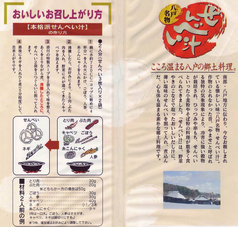 - 商品紹介文 : 八戸せんべい汁研究所公認で、青森県庁の青森正直マークを取得している製品です。